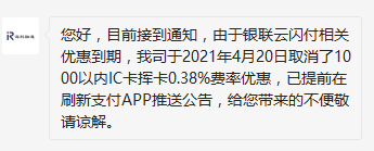 支付通闪付0.38%费率取消,再见了小额0.38接银联最新通知:二维码及NFC移动支付业务优惠措施续展一年IC卡小额免签免密业务优惠措施不再续展也就是说,我们使用扫码和手机NFC闪付还可以继续享受0.38%费率优惠而使用IC卡也就是芯片卡直接闪付则不再享受0.38%优惠费率,费率统一调整为正常刷卡交易费率。海科融通合规运营,严格遵守银联和其他监管机构规则,现进行系统升级,费率整改。支付通作为海科融通的旗舰产品,以后也不再享受0.38%优惠费率。